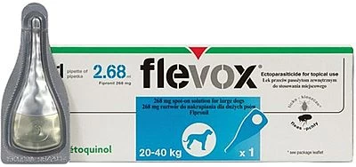 Flevox Spot-on Large Dog 20-40kg is for the treatment of flea and biting/chewing lice infestations in dogs. Flevox for Dogs is also for the prevention of ticks, and can be used as part of a treatment strategy for Flea Allergy Dermatitis, where this has been previously diagnosed by a veterinary surgeon.